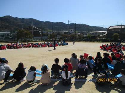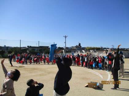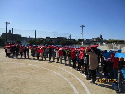 秋晴れの下、本日2校時に全校で航空写真撮影を行いました。1年生から6年生までの児童と教職員が、運動場に白線で描かれた校章の形の上に色画用紙を持って並びました。撮影は大阪からやって来たセスナ機から撮ってくださいました。撮影後、子どもたちは大空を見上げてセスナ機に手を振っていました。子どもたちは担当の方の話をしっかり聞いて行動していたので、撮影をスムーズに終えることができました。