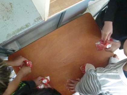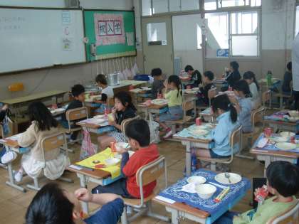今日の給食は、パンとクリームシチュー。たくさん食べて、食缶は空っぽです。牛乳パックも上手に開いて洗える子どもたちが増えてきました。