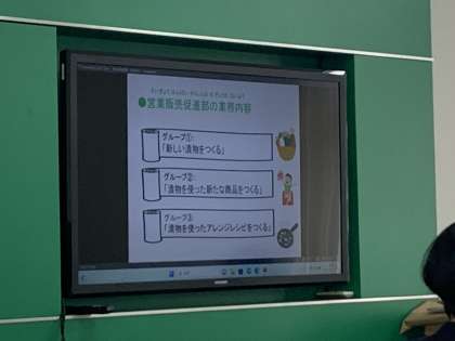 新商品のアイディアなどについて意見を出します。