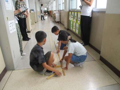算数の時間にろう下の長さはどれだけあるのか調べることになりました。最初は,1mものさしを使って図っていましたが,それぞれの班がバラバラの結果になりました。もっと正確に測るには、巻き尺(メジャー)で測ればいいということに気が付きました。この時間に巻き尺は,長い長さを測るときに便利だということが分かりました。
