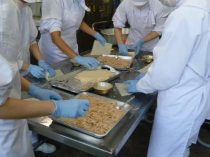 “春巻”は、まぐろフレーク・たけのこ・しいたけ・はるさめに味つけをして具を作り、春巻の皮に包んで、油で揚げました。子どもたちは、給食調理員が1本ずつ丁寧に巻いた手作りの春巻を味わって食べました。