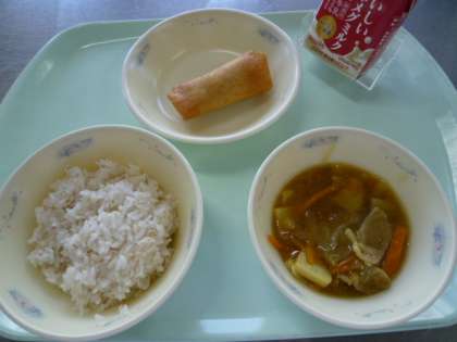 10月12日の献立は、「麦ごはん・牛乳・カレーあんかけごはん(具)・春巻」でした。
