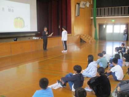 11月の朝会では,野球の大谷翔平選手を例に取り上げ,目標を持つことが大切であると校長先生からお話がありました。普段の学習も今月に行われる生活・樹学習でも目標を持って頑張る姿をみたいと思います。また,先日行われた6年生の陸上記録会で好成績をおさめた児童に表彰がありました。