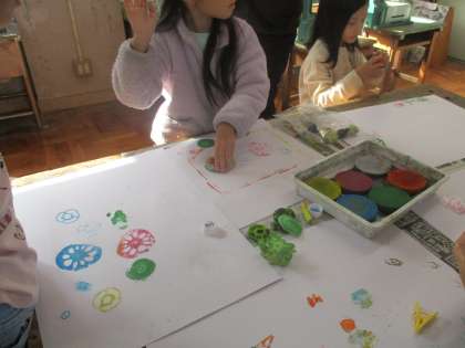 図工の時間では、野菜のきれはしや段ボールやカップなどを使って絵をかきました。ピーマンやレンコンなどの断面がきれいに写って、とても面白い絵が描けていました。