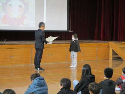 図画コンクールの表彰がありました。体育館が大きな拍手に包まれました。