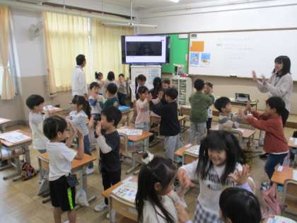 音楽の時間では、リズムに合わせて手拍子をしたり、友だちと体を動かしたりして音楽を楽しんでいました。