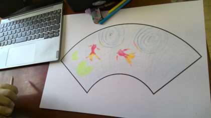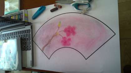 「和」を感じる色や形を見つけた後は、扇子のような形をした紙に、自分の「お気に入りの和」を表しました。