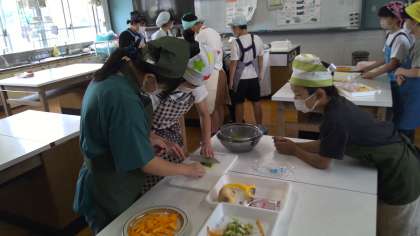 エプロンや三角巾をつけ、準備万端!どのグループも、みんなで包丁の扱い方や野菜の切り方を確かめながら、慎重に活動することができていました。「にんじんって、硬いし切るのが大変やな!」「ピーマンの種って、細かいし取りにくい!」など、やってみて気づいたことがたくさんあったようです。