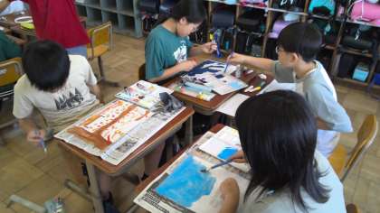活動の初めに、和紙を思い思いの色に染めたり、模様をかいたりしました。光のすけ具合を考え、光が通るように色を薄くしたり、反対に光を遮るよう色の濃い部分をつくったりと、くふうする姿が見られました。また、「わたしの感じる和」で学習したことを生かし、和の模様や絵をかく子も見られました。
