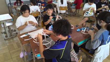 和紙ができたら、骨組みづくりです。紙バンドをホッチキスでとめ、ランプシェードの形をつくりました。友達の骨組みを見て「あっ、そういう方法もあるか!」とヒントを得たり、友達と相談したりしながら、楽しんでつくる様子が見られました。