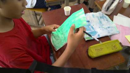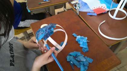 骨組みができたら、いよいよ和紙を貼っていきます。しかし、立体的なものに紙を貼っていくのはとても難しいことです。はじめは、「先生、はがれてくる!」「丸くなってるところは、どうやって貼ろう?」という声が聞こえてきました。しかし、お互いの活動を見合う中で、「和紙をちぎって貼ったらいいのか!」「和紙に接着剤を染み込ませたら柔らかくなるから、貼りやすい!」などと、たくさん気づきがあったようです。そして、お互いに気づいたことを教え合いながら、丁寧に和紙を貼っていきました。