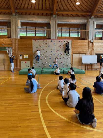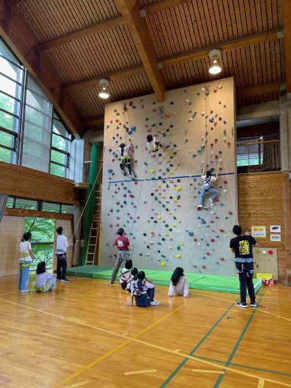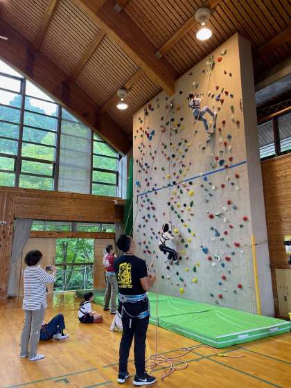 昼からのオリエンテーリングは天候のため、ボルダリングに変更しました。10メートル以上ある壁を登りました。