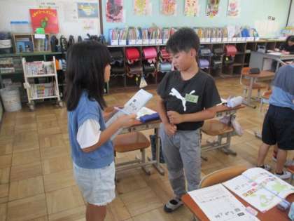 英語の時間では、自分の好きな時間を工夫して伝える学習をしています。この時間では、事前に言い方は学習できているので、いろいろな人とペアになって相手に伝える学習をしました。何人も伝える内に、とても上手に伝えられるようになりました。