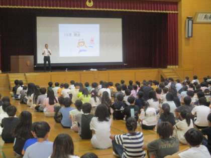 10月に入り朝会が行われました。今週は運動会が近いので、最後まであきらめないでやり遂げることについて校長先生からお話がありました。「へなちょこ」という本を読んで頂き、最後まで静かに聞いていました。運動会も目標をもって、最後まであきらめないでがんばってほしいと思います。