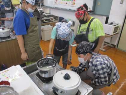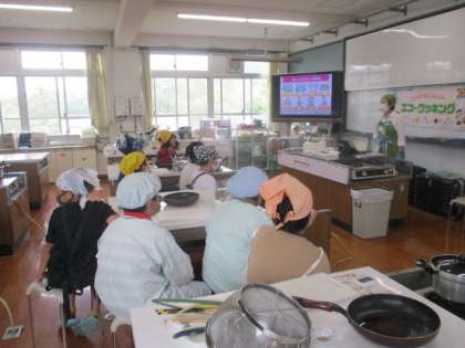 家庭科の時間には、大阪ガスの方から「エコクッキング」という言葉を教えて頂き、ごはんとお味噌汁を調理しました。材料を買いにく段階からごみになるまで、たくさんエコできる事を学習できました。