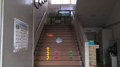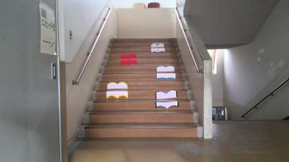 図書室に続く階段には、たくさんの本。春日野水族館と呼ばれる水槽がある階段には、魚やいそぎんちゃく。体育館前には、ボールや跳び箱。給食室の近くには、かぼちゃ。渡り廊下には猫…と、子どもたちの手によって、学校中に楽しいものがどんどん生まれました。