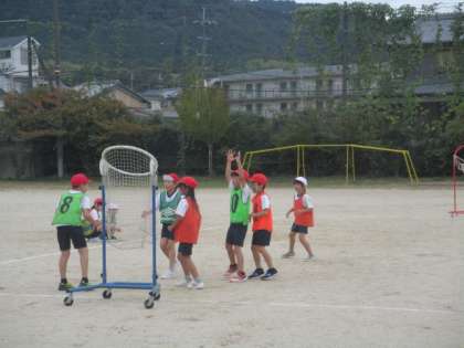 体育の時間では、パスゲームを学習しています。チームでパスを回して、ゴールにボールを入れます。相手にとられないようにするために、チームで話し合って作戦をたてます。作戦が上手くいった時は、チームで喜んでいる姿が見られます。