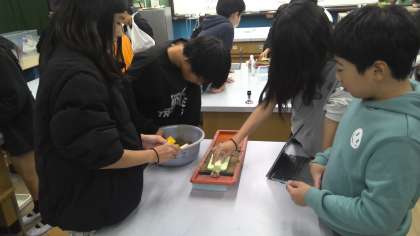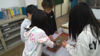 理科では「流れる水のはたらき」の学習をしています。この日は、水の量によって水のはたらきがどのように変化するのかを実験で確かめました。