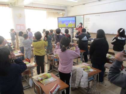 英語の時間では、「お話を読もう」の学習をしています。まず最初は、英語の音楽に合わせて体を動かしました。
