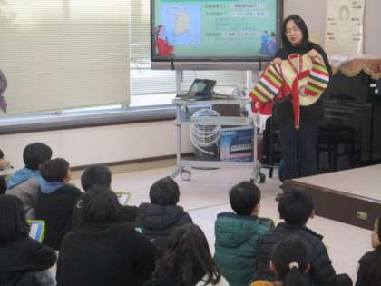 「他の国を知ろう」をテーマに人権学習を行いました。4年生では、韓国からのゲストティーチャーをお呼びして、学習を進めました。韓国の民族衣装や食べ物、小学校の様子など色々なことを教えてもらいました。日本の文化とは違うという正しい知識から、お互いを認め合うという気持ちを学ぶことが出来ました。
