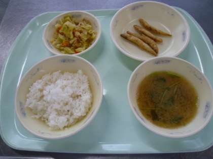 3月5日の献立は、「ごはん・わかさぎのこはくあげ・春野菜のおかか煮・みつばのみそ汁」でした。今月の和食推進の日「和(なごみ)献立」です。