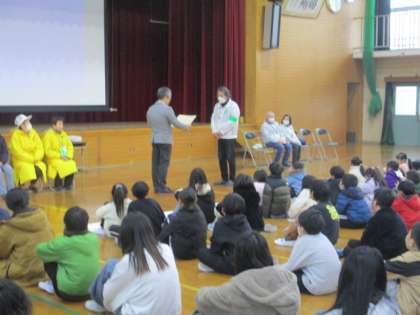 先日、感謝の集いが行われました。いつも登下校を見守ってくださっている見守り隊の方に感謝状と学校で育てたお花をお渡ししました。また、6年生が学校を代表して感謝の言葉を、全校では「笑顔の花がさくように」を歌って感謝を伝えました。