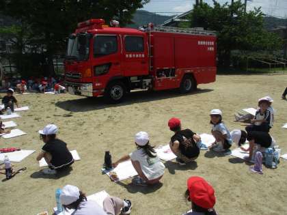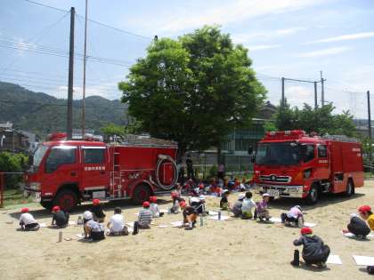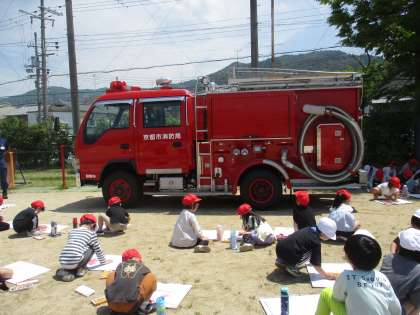 火災発生時の避難訓練の後,1・2年生は消防車の絵を描きました。自分たちのお気に入りの角度からみて、迫力のある消防車を描くことができました。みんな一生懸命に集中して描いていました。