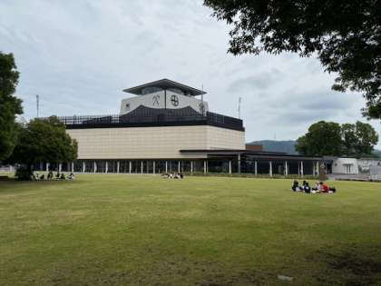 今は芝生広場でお弁当を食べています。