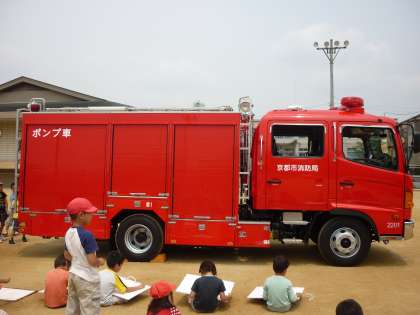29日(火)の避難訓練の後に,1・2年生は消防車の絵を描きました。普段こんなに近くで見る機会のない消防車に大興奮の子どもたち。はしご車とポンプ車からそれぞれ好きな方を選び,思い思いに描き始めました。大きなタイヤ,真っ赤な車体,素敵な消防車の絵が完成しそうです。