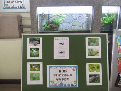 春日野小学校の図書館に向かう階段の踊り場に、子どもたちのアンケートから名付けられた「春日野すいぞくかん」という大きな水槽があります。子どもたちが図書館に向かう際に、足を止めて熱帯魚の様子をよくみています。