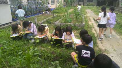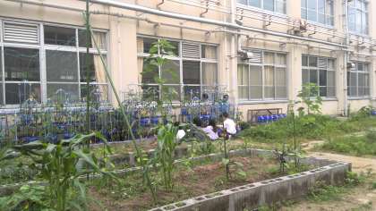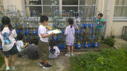 中庭で育てているミニトマトや夏野菜を観察して、観察記録を書きました。「・・・を見つけました。」「・・・に気が付きました。」「・・・がわかりました。」という文型を利用して書きました。