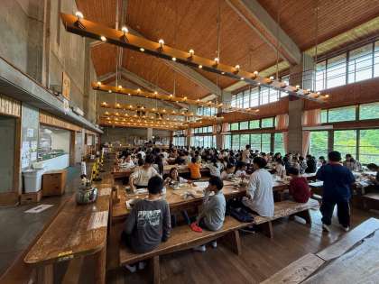 花背山の家に到着しました。山道なのでバス酔いが心配でしたが、みんな元気です。花背は曇り空、少し涼しいです。