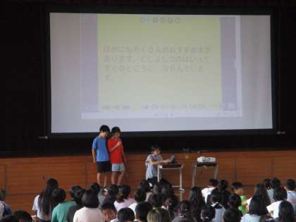 7月の児童朝会では、各委員会からのお知らせがありました。給食委員会からは、おいしく給食を食べるために、図書委員会からはおすすめの本など各委員会とも工夫をこらして発表していました。