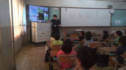 先生に自己紹介をしてもらいました。自己紹介の途中に、クイズをしたり、英語の発音を教えてもらったりしました。