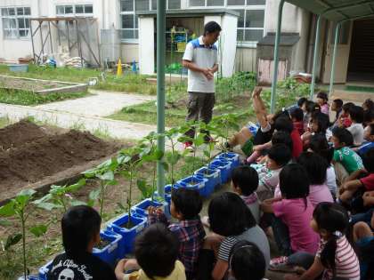 12日(火)にさつまいものなえを植えました。畑の土はとても固く,耕すのがとても大変でしたが,みんなとてもよくがんばりました。秋には収穫し,おいもパーティがひらけたらいいなと思っています。