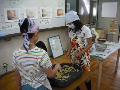 枝豆から大豆に変身することや大豆からきなこや豆腐などいろいろな食品に変身することを知りました。そこで,本当に変身するのか,まずはきなこづくりをしました。また,そこで日頃なかなか聞かなくなった「いる」という言葉やオノマトペ(擬音語や擬態語の総称)に着目しつつ,楽しく活動しました。大豆の皮をむくのも指先を使って丁寧にむきました。大豆をすりつぶす作業がなかなか難しかったのですが,交代しながら協力してできました。