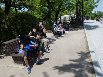 原爆ドームをバックにクラス写真を撮って,子どもたちお待ちかねのお弁当タイム。