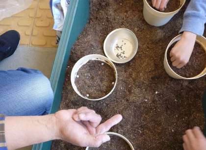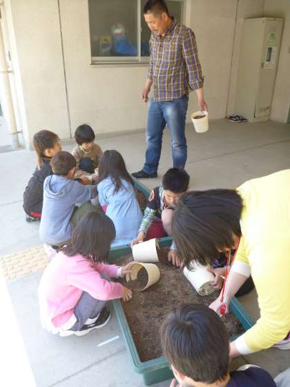 ゲストチィーチャーの山本さんに種まきの仕方を教えていただきました。