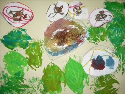 葉は,実際のあじさいの葉をスタンプしました。