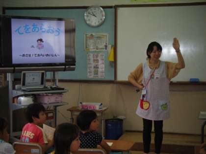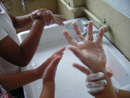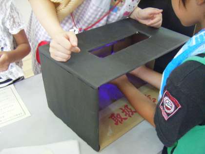 汚れた手をどのように洗えばよいのか教えてもらいました。そして,実際に石鹸を付けて手洗いをしました。洗い残しがないかチェッカー1号・2号に手をいれて確認しました。