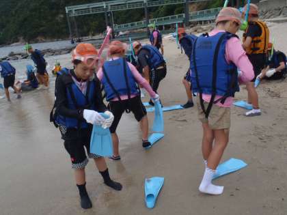 まずはスノーケリングの紹介。フロティングジャケット・スノーケル・フィンをつけて海の世界へ!