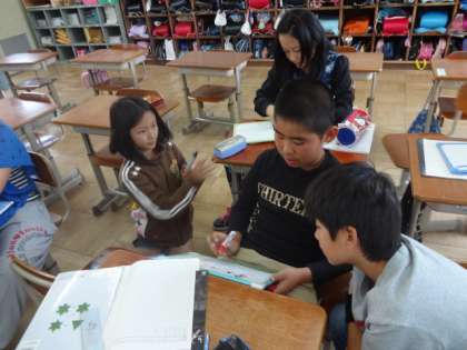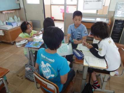 少人数グループに分かれ、図や絵を使って友達と説明し合う学習をしています。