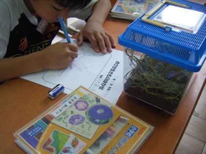 生活科の学習で生き物を観察しました。昆虫や魚をじっくりと観察し、丁寧に絵をかいたり気付いたことを文章で書き表したりしました。大切に育てている姿がとってもほほえましいです。