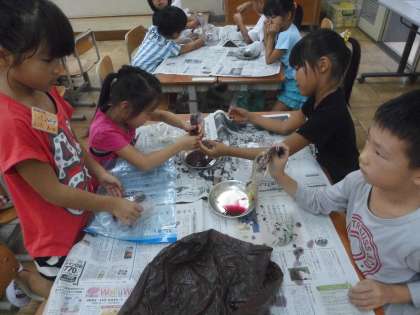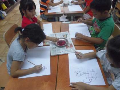 自分たちで育てた朝顔の花を集め、それをしぼりとって色水を作りました。