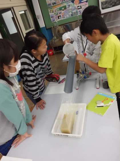 6年生の「土地のつくりと変化」の学習で,水の中でどのように地層ができるのかを実験で調べました。