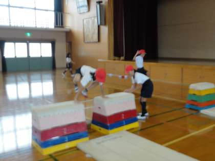今までのとび方に加えて,かかえこみとびや台上前転を練習しています。