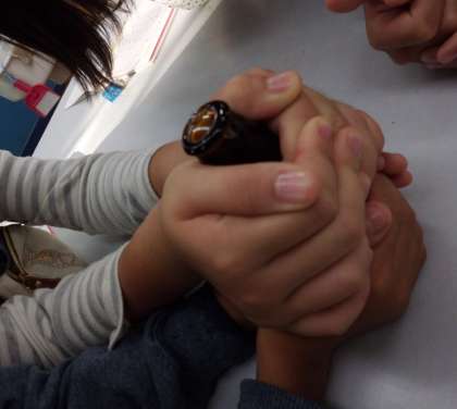 ペットボトルの口にもせっけん水のまくをつけて手でにぎる実験もしました。