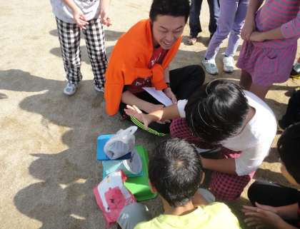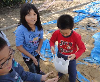 量感を育てるために,「1kgの重さの砂を袋につめる」学習です。