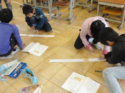 1mのテープを折ったり,しるしをつけたりしながら作りました。