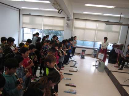 ミニコンサートの中盤には,4年生によるリコーダーの演奏や教えていただいた歌を一緒に歌う時間がありました。きれいな歌声がミニホールに響きわたっていました。